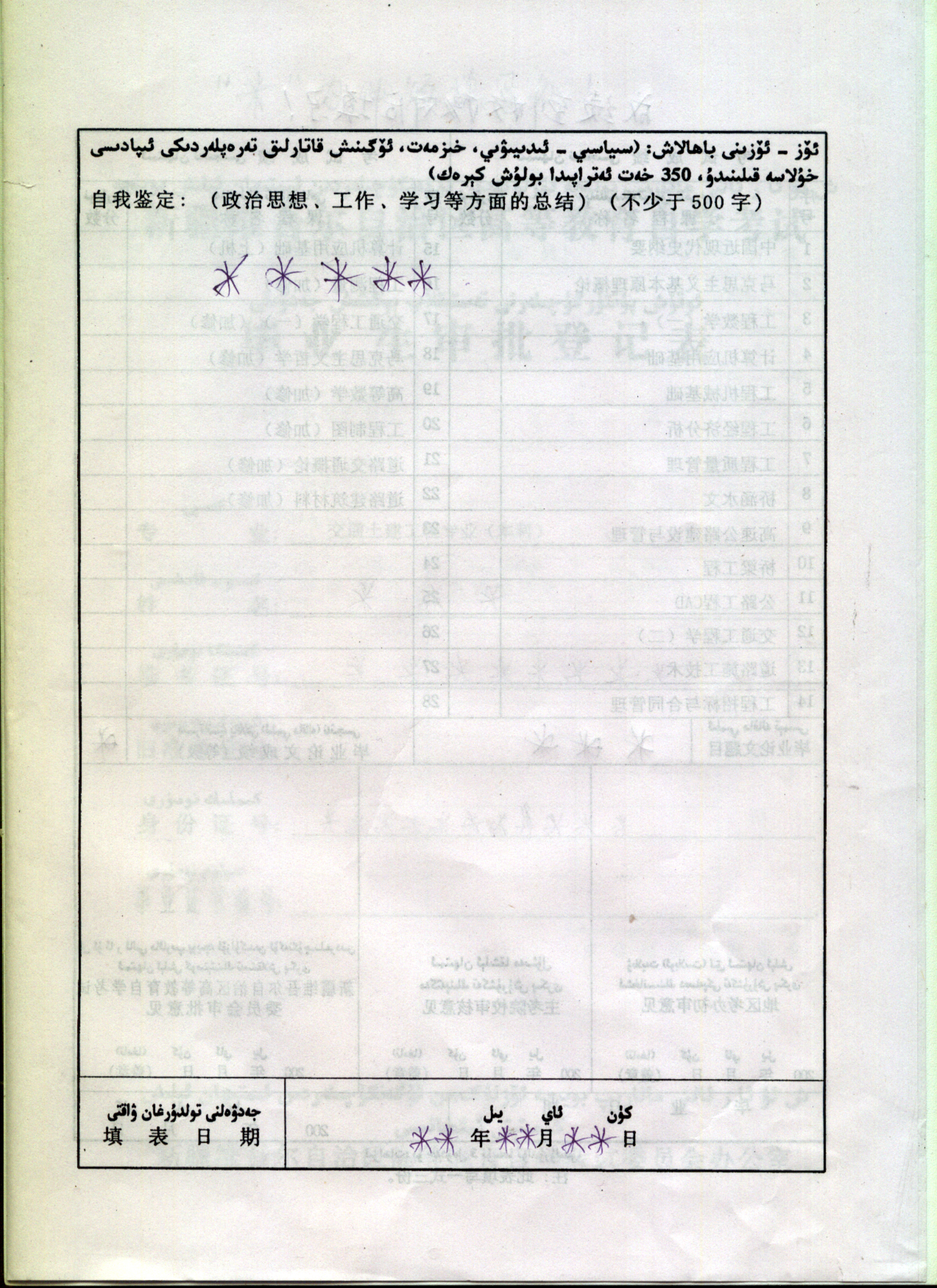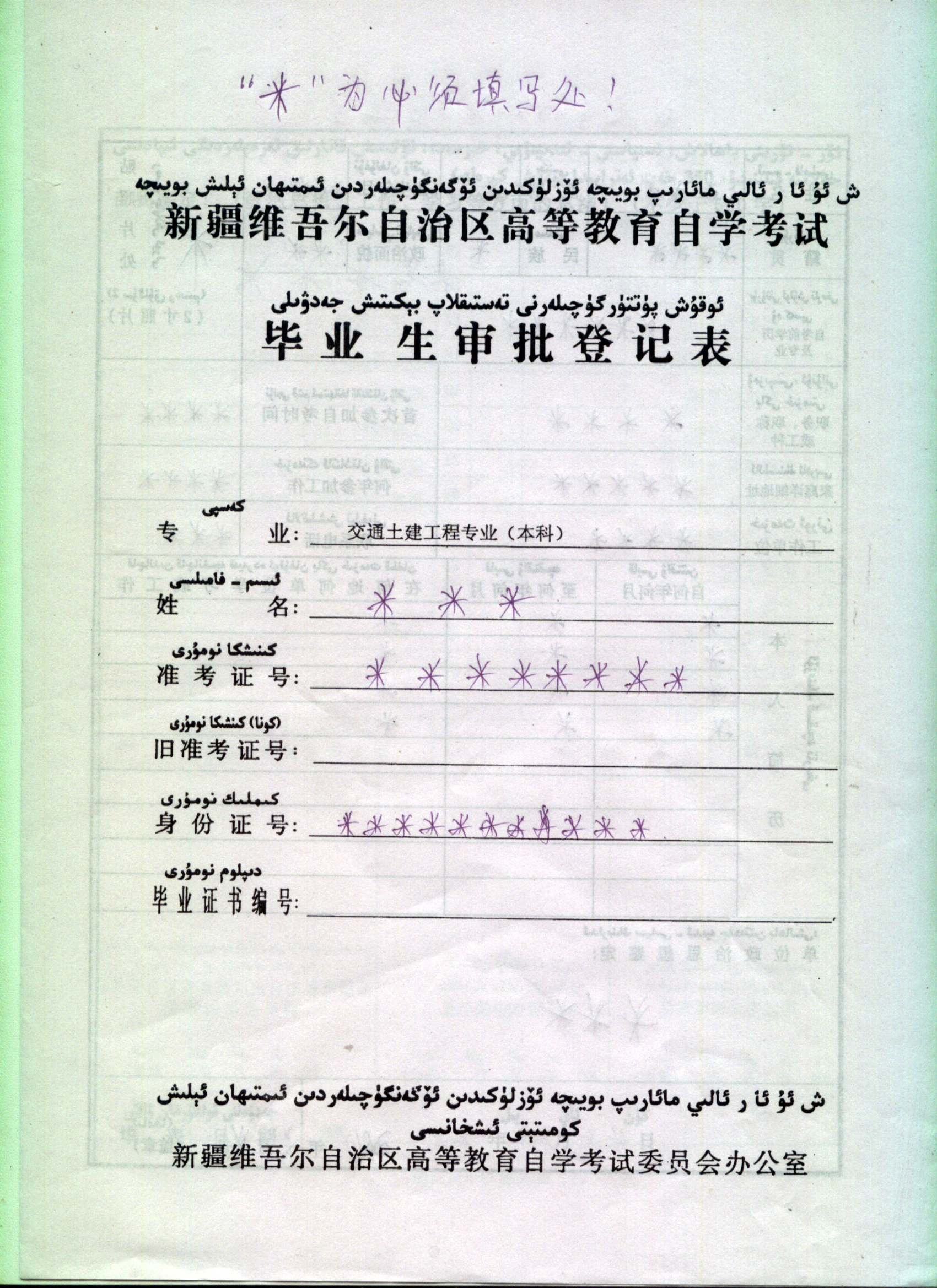 1、每个符合毕业条件的考生到校领取所报专业的“毕业生审批登记表(新版)”一式三份(由考生本人手工填写正确信息并贴好两寸蓝色背景相片,相片格式要求与本通知第2条电子相片相同并为同一底版,为保证填表质量,建议考生先将空白表复印一份做草稿用,定稿后再誊写到正式表格上,“单位政审”栏目必须由单位签署意见并加盖公章,“成绩”栏目由站点工作人员统一填写),表格填写要美观整洁,不得有涂改现象。(特别提醒:由于网上下载的表格维文不能正确显示,新疆考办明确指示网上下载不正确维文的毕业生审批登记表无效!所发毕业生登记表复印无效!);