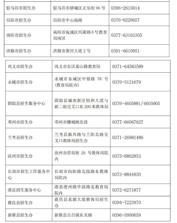 附:河南省2022年全国成人高校招生考试各地教育招生考试机构咨询电话